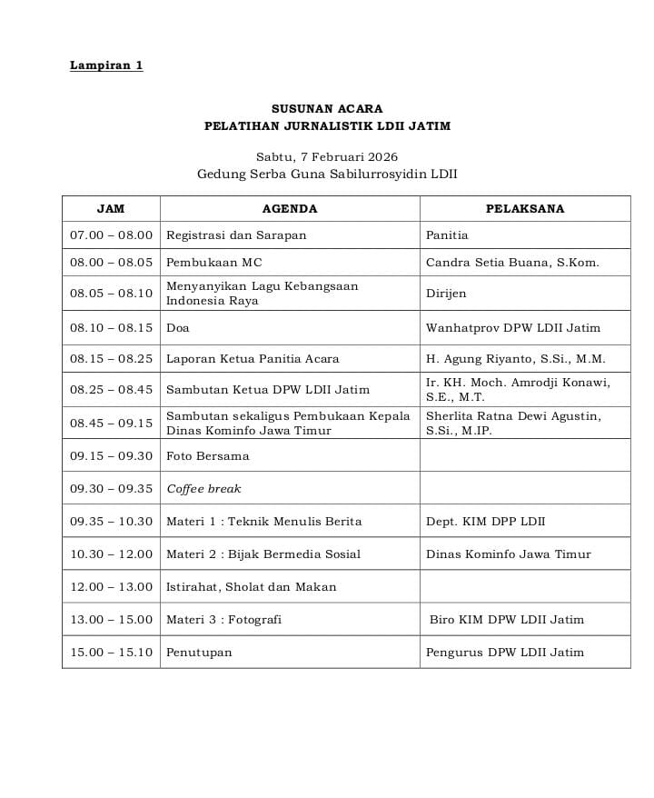 SURABAYA (9/2) – Di tengah derasnya arus hoaks dan disinformasi di media sosial, Dewan Pimpinan Wilayah (DPW) Lembaga Dakwah Islam Indonesia (LDII) Provinsi Jawa Timur menggelar Pelatihan Jurnalistik se-Jawa Timur. Kegiatan tersebut berlangsung pada Sabtu (7/2/2026) di Gedung Serba Guna Sabilurrosyidin LDII, Surabaya.